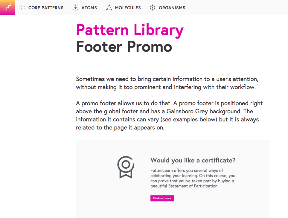 Technically a pattern library is a simple collection of UI components, but in order for design system users do their best work, a pattern library should also present other important info. Let's take a look at what information can be displayed alongside each pattern Title The name of the pattern should be prominent and easy to understand by everyone who visits the pattern library. Naming things is hard, but teams should strive to agree upon names that make sense for everyone, rather than only developers. Conducting an interface inventory exercise is a great way to discuss and agree upon UI pattern names. [caption id="attachment_9911" align="alignnone" width="963"] Each pattern in FutureLearn's pattern library prominently displays the pattern title[/caption] Description A succinct definition should be provided to help people understand what the pattern is and what it does. Some patterns can be easy to discern ("data table") while others might need more of an assist ("jumbotron"). [caption id="attachment_9909" align="alignnone" width="1024"] Each pattern in the Draft U.S. Web Design Standards pattern library has a succinct definition for each pattern[/caption] Live Example A key characteristic of any pattern library is displaying a living, breathing instance of a pattern. Showcasing a live pattern allows teams to demonstrate responsiveness, interaction, motion, ergonomic considerations, true color & text rendering, and performance, which are all things a static picture can never show. [caption id="attachment_9916" align="alignnone" width="1024"] MailChiimp's pattern library displays a live example of each pattern in their library.[/caption] Context While showing an abstracted live UI pattern is a necessary part of any pattern library, it's also important to show how and where that pattern gets used. Material Design does a fantastic job at putting a component in context of actual applications. [caption id="attachment_9904" align="alignnone" width="1024"] Material Design shows context for its UI components using plenty of images and videos[/caption] Screenshots and videos can be used to show a pattern in context. While these media are certainly effective, it can involve a lot of manual effort to produce them. One of my favorite features of Pattern Lab is pattern lineage, which shows exactly which patterns make up any given component, as well as shows where that pattern is used. [caption id="attachment_9906" align="alignnone" width="853"] Pattern Lab's lineage feature displays what patterns make up any component, and also shows all the places that component is employed.[/caption] Usage When should you reach for a toggle pattern instead of a group of radio buttons? Should you use tabs or an accordion? Showcasing dos, don'ts, rules, and considerations for each pattern can help design system users reach for the right tool for the right job and take a lot of the guesswork out of the implementation. [caption id="attachment_9919" align="alignnone" width="884"] Material Design's usage contains information about when to reach for a particular pattern, as well as extremely specific sizing, spacing, and design instructions.[/caption] Code Almost every pattern library out there displays the appropriate component code alongside the living instance of a pattern. But what code is relevant to show? It depends on the type of design system you're maintaining. For integrated design systems like Rizzo, the only code that gets exposed is the code necessary to pull a pattern into the application. For less integrated systems, frontend markup and/or CSS and/or JavaScript might be provided for users to copy and paste. Here's some of the code
