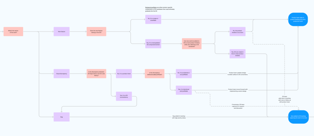 An more nuanced governance process We've dug into these details with a number of clients, and I've updated our design system governance diagram to detail how to handle these different scenarios. One the teams are chatting, they can unpack the scenario and figure out what — if anything — needs to be done. One of best outcomes is that no new work needs to happen and the DS team can guide the product team to existing solutions and save hours, days, or weeks of unnecessary work. Hooray! But if the teams agree that new work needs to happen, the next question to ask is "What's the nature of the new work to be done?" Handling bugs If the issue is truly a bug , the design system team should address it with extreme urgency and release a patch as soon as possible. Addressing true defects in the live system should be the highest priority for the design system team; teams won't trust or use a busted system. Handling visual discrepancies In the case of a visual discrepancy, the first question to ask is: "is this an issue with the design system?" If it's a misalignment between the design system's design and code libraries, it should be treated as a bug and addressed immediately. But often it's a product-level discrepancy where a product designer has either deviated from the system or invented new design patterns. In those situations, it's important to ask: are these changes deliberate and intentional? Perhaps a product designer created some purple buttons simply because they like the color purple. Through conversation the teams can determine that deviation isn't justifiable, so the course of action should be for them to update the design to better align with the design system. But! Perhaps the purple buttons were created to run and A/B test or to support a specific campaign. In that situation, the teams may agree that's deliberate and justifiable, so the product team can carry on implementing that custom UI solution. The design system team should make a note to follow-up with the team to hear how things turned out. Handling features Often product teams have needs that aren't handled by the current design system library. For these situations, the first question becomes: Does the feature belong in the design system? Many times, product teams need to create and own their own recipes — compositions of core design system components and/or custom UI elements. Those recipes should be used consistently within a product, but may not be universal enough to include in the core design system team. The design system team can help guide the product teams to create and own their own recipes that work with the grain of the design system. In other situations, a new feature should indeed belong in the core design system. In these cases, the question becomes: can that work happen to meet the product team's timeline without sacrificing the high standards of the design system? If the answer is yes, then great! The work can be built into the system. However if there's not enough time, the product team should own that work in order to meet their deadline, and the DS team should add it to their backlog to address it when they can. Design systems die in the darkness We've trained the design system teams we work with to be extremely skeptical when they don't hear from consuming teams. When you don't hear from them, it's typically not a sign of "everything is going great" and is more likely "something is going very wrong." So be proactive and reach out. When in doubt, have a conversation. Design system governance involves coming together and collaborating on the best way to handle fuzzy situations. It's critical for teams to collaborate, communicate, and dig into the nuance of a situation to determine the best course of action. Hopefully this framing can help your team be effective. We help organizations of all shapes and sizes establish and evolve their entire design system practice: from assets and architecture to people, process, and culture. If you could use help taking your design system to the next level, feel free to reach out!