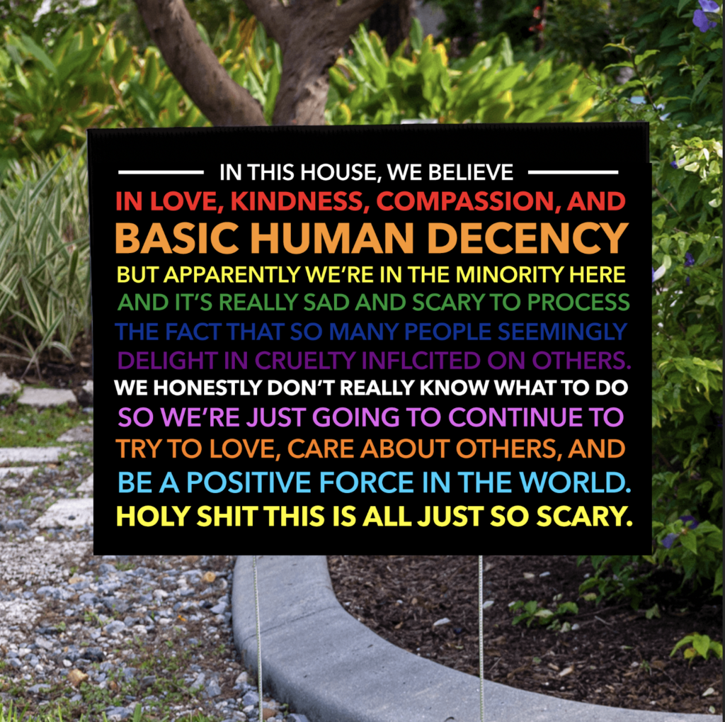In this house... 11 November 2024 politics Brad Frost In this house... I made this sign to try to capture how I'm feeling about everything right now.
