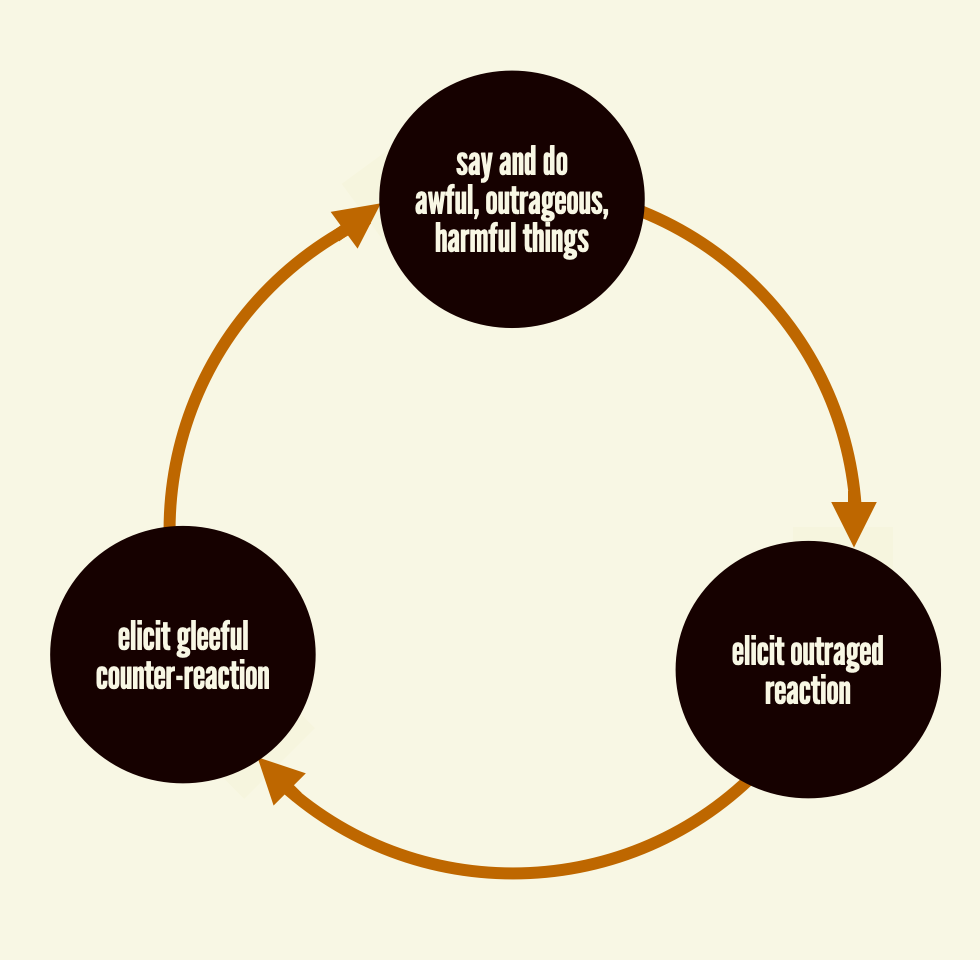 Gray details how our perception of harm is shared by all of us, but who exactly is getting harmed is where minds diverge. Your perception of harm (and potential for it) influences your answer to "Pick one: Black or Blue Lives Matter?" Outraged and The Righteous Mind: Why Good People Are Divided by Politics and Religion are well worth reading as they dig into the psychological and moral forces that influence our deeply-held beliefs. With The Situation, these forces are on full display like fucking 4th of July fireworks. The malignant narcissists and their repugnant lackeys are fully aware that thinking, caring, feeling, empathetic people want to reduce harm to people, animals, and the Earth. The malignant narcissists found a weak spot called compassion, and now they are attacking it — nay,spamming it repeatedly. This sets up what I suppose you could call the "Own-The-Libs Cycle":
