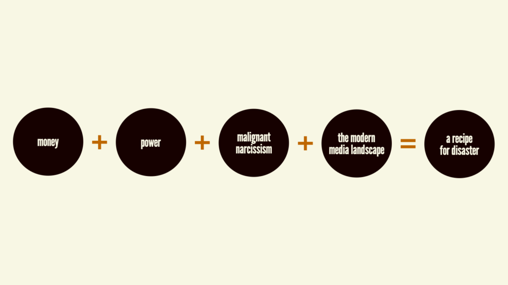 The troubled kid who's flailing, yelling, and breaking things is doing this because he's desperately trying to get the attention of the adults around him. Like many behavioral issues that plague adults, malignant narcissism stems from the tragedy of children being deprived of love and attention. Those children grow up to adopt maladaptive behaviors that ultimately harden into a full-blown mental health disorder. Mental health, man. It horrifies me that mental health isn't a front-and-center part of any conversation around The Situation. We look past this factor at our own peril, as everything stems from the mind. Imploring malignant narcissists to consider the perspectives, wellbeing, and plight of other people is as futile as telling someonesuffering from depression to "just be happy!" May I have your attention, please? Malignant narcissism coupled with the [attention economy](http://Absolutely deliberately done, but it's also clearly a compulsion.) and our current media landscape proves to be an extraordinarily potent — and dangerous — combination. For decades, **we've all beenfrogs as our media landscape boils over: **always becoming more breathless, hyperbolic, sensationalist, crude, black-and-white, polarizing, splintered, bite-sized, watered down, infotaining, illogical, anti-intellectual, infantilizing, unmoored, uncaring, commoditized, capitalized, "content"-ized, etc, etc. Use whatever words you want, but thoughtful and nuanced it ain't. Our primate brains — orders of magnitude out of our evolutionary depths! — have beenragdolled by a frothy, relentless, unceasing media tsunami. The result is complete disorientation. We become unmoored from logic, rationality, values, and our shared humanity. We watch in horror as loved ones become swallowed whole by hyperbolic talking points, or worse travel further down increasingly-unhinged rabbit holes. We even begin to question our own sanity: "what exactly is truth, anyways?" And in this state is where the malignant narcissists find us. Muddled and confused, like juvenile antelopes separated from the herd. The malignant narcissists cynically (and, as covered above, compulsively!) weaponize the media landscape to help them achieve their primary goal: for you to pay attention to them.