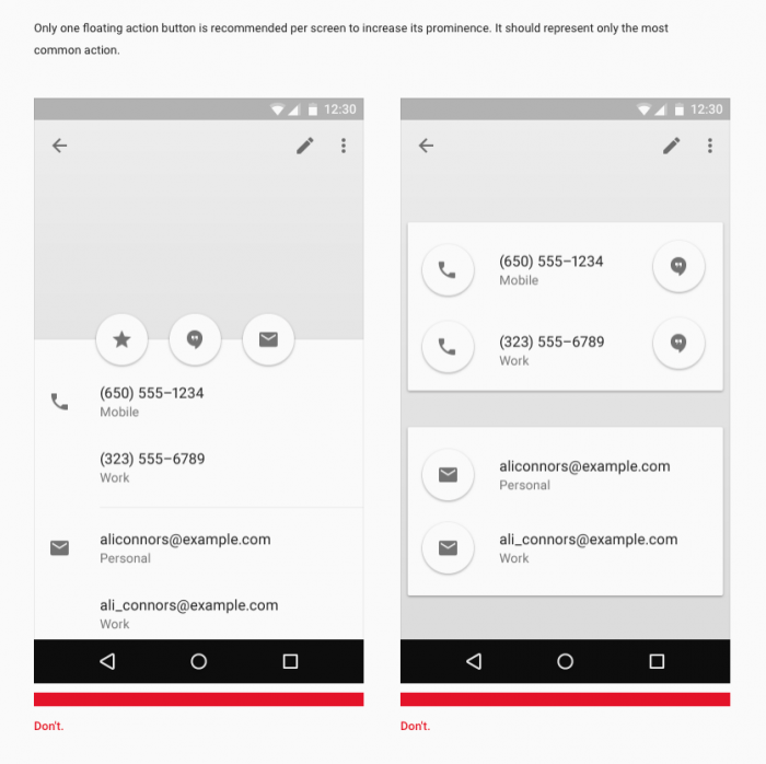 At the heart of a good design system is a set of solid, flexible components that can be arranged to create cohesive, delightful user interfaces. There's an oft-repeated misconception that pattern-driven design and development forces teams to use a finite, rigid set of components that stifles creativity and doesn't serve the real needs of applications. That's only true if you design the system that way. An effective design system provides components that are robust, resilient, flexible, and adaptable. Let's talk about some of the ways in which patterns can be designed for flexibility. Content This is the whole idea of pattern-based design and development. You create a component, and then use that component by putting different content inside of it. Components must be able to handle a variety of content that could be poured inside them, so it's crucial to make aclean separation between a component's structure and the actual content. If a publication has headlines that could be 24 characters long as well as 240 characters long, the components used to display those headlines need to be flexible enough to handle those different kinds of content. How do you do that? It's important to bake that into your process so content edge cases don't surprise you and your team at the 11th hour. Design with dynamic data so you can rest assured your components can handle empty states, short content, extremely long content, and everything in between. Structure This type of pattern variation that involves adding or omitting an optional element of a component. You may have buttons that contain just text, an icon and some text, or just an icon. For most of these components, the style and behavior remain the same and only the HTML is affected. However, for some components the style must be adjusted if an HTML element is present or is absent. So let's talk about style variations. Style If you establish a CSS architecture that uses a BEM-like syntax, you might create component blocks that look something like .c-table. The block defines the default styling rules for the component. But those styles may not work for every scenario. So the team needs to define one or several style variations of the component to serve the needs of their applications. For our table example, we might make a .c-table--condensed and/or .c-table--striped variation. The powerful thing about style variations is that these modifiers can often be combined, which provides teams with a lot of design flexibility but is still built on the same structural and stylistic foundation. For instance, authoring `` results in a button that has secondary styling (which may involve a different background color) but is also larger than the default button styles. This type of controlled flexibility is what makes for powerful design systems. Behavior This type involves creating variations of a component that provides certain interactive behavior. Think of buttons that can be toggled off and on, cards or alerts that can be dismissed, and data tables with selectable or draggable rows. These behavioral are often coupled with structural and stylistic variants (for instance, adding the X button to the alert component in order to achieve the desired behavior). Documentation is oh-so-critical Creating documentation is just as important as creating the components themselves. Providing a slew of components with variations is all well and good, but if teams don't know how to utilize them properly, you'll end up just giving them more ingredients to create bad user experiences. The style guide is the storefront where your components and their variations are displayed alongside usage guidelines, examples, links to live apps, etc. That added context helps steer design system users in the right direction so they implement the components in the way the makers designed the system. Material Design's floating action button is a great example of usage documentation in action. Without proper documentation, it's easy to see how this very unique circular button pattern could be abused by implementers who simply like circles and would want to stuff them everywhere. So the system designers lay out very clear documentation on how these components should (and shouldn't) be used: At the end of the day, take the time to craft a set of robust, flexible, and extensible components for your design system. Properly document these variations in the style guide and provide usage guidelines to help people reach for the right pattern in the right context.