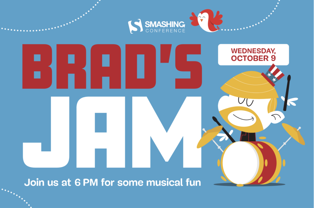 - Hosting a music jam session after the conference on October 9th! Because the Smashing crew is so amazing, they've lined up an amazing rehearsal space kitted out with instruments for interested attendees to join and play. What to expect? When we first did this in Antwerp, we ended up having an absolute blast blending everyone's talents and instincts together. I'm VERY excited for this!