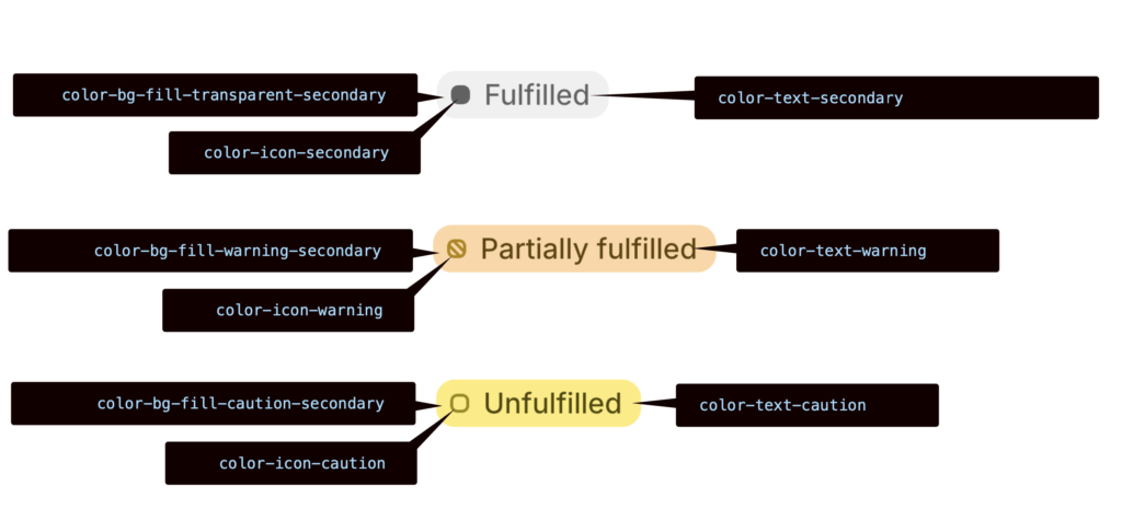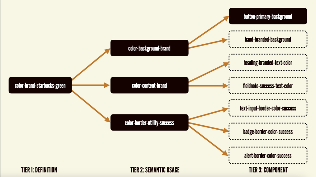 - Tier 2 tokens map Tier 1 tokens to specific roles in a user interface